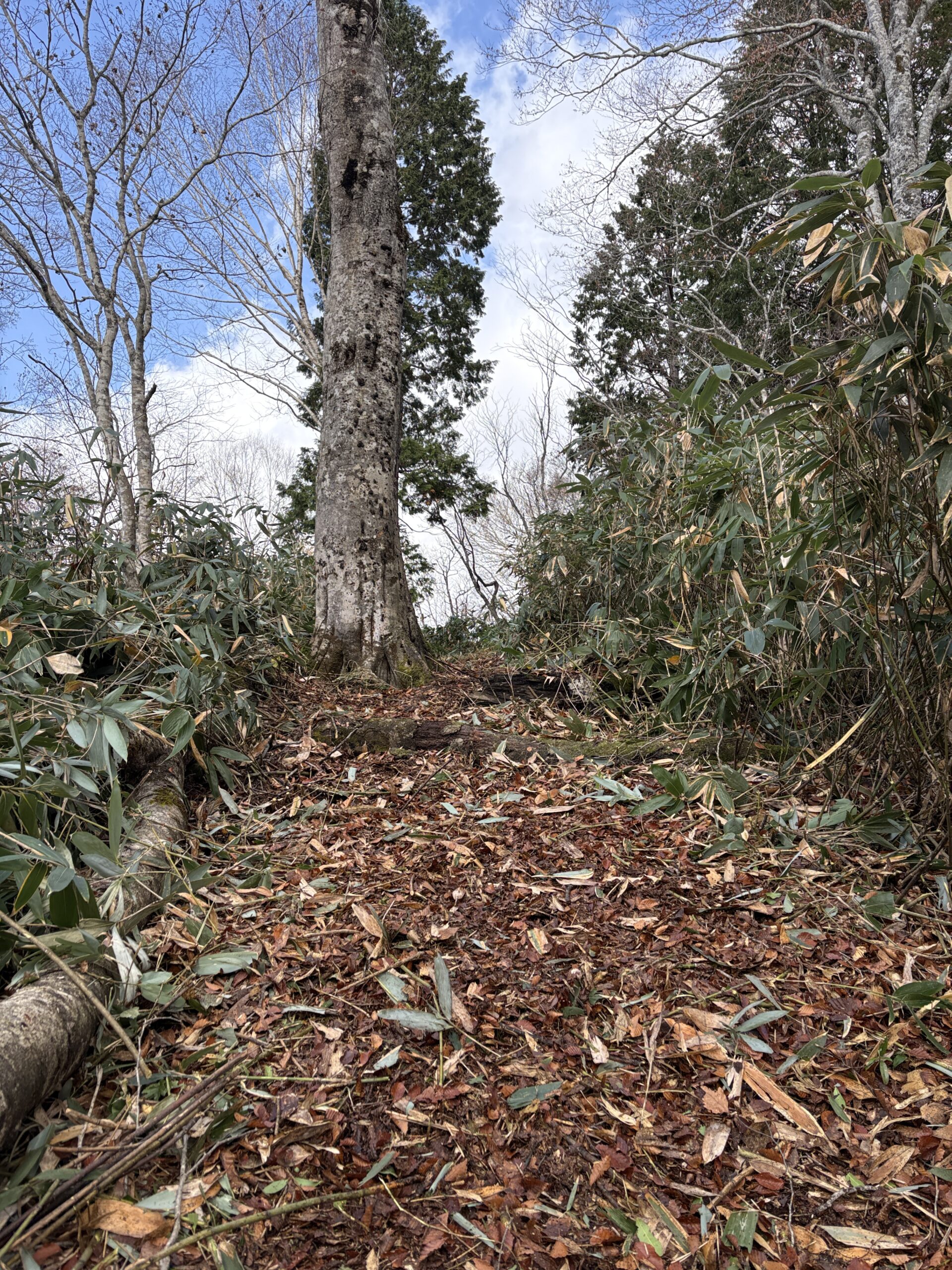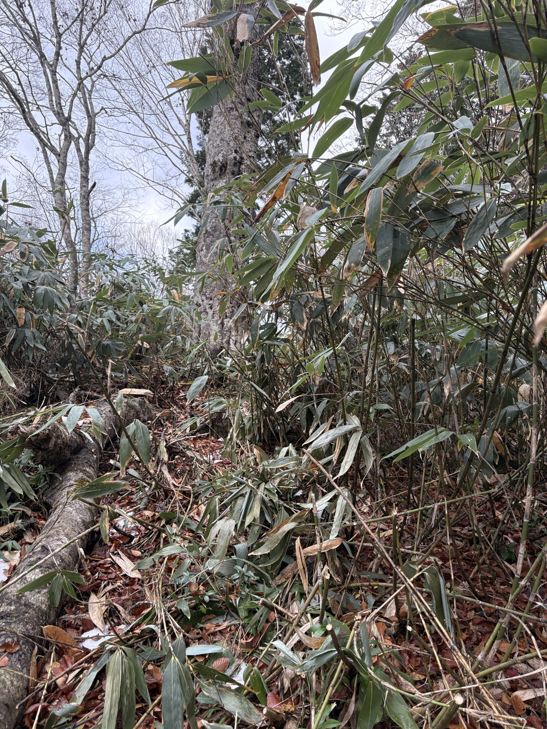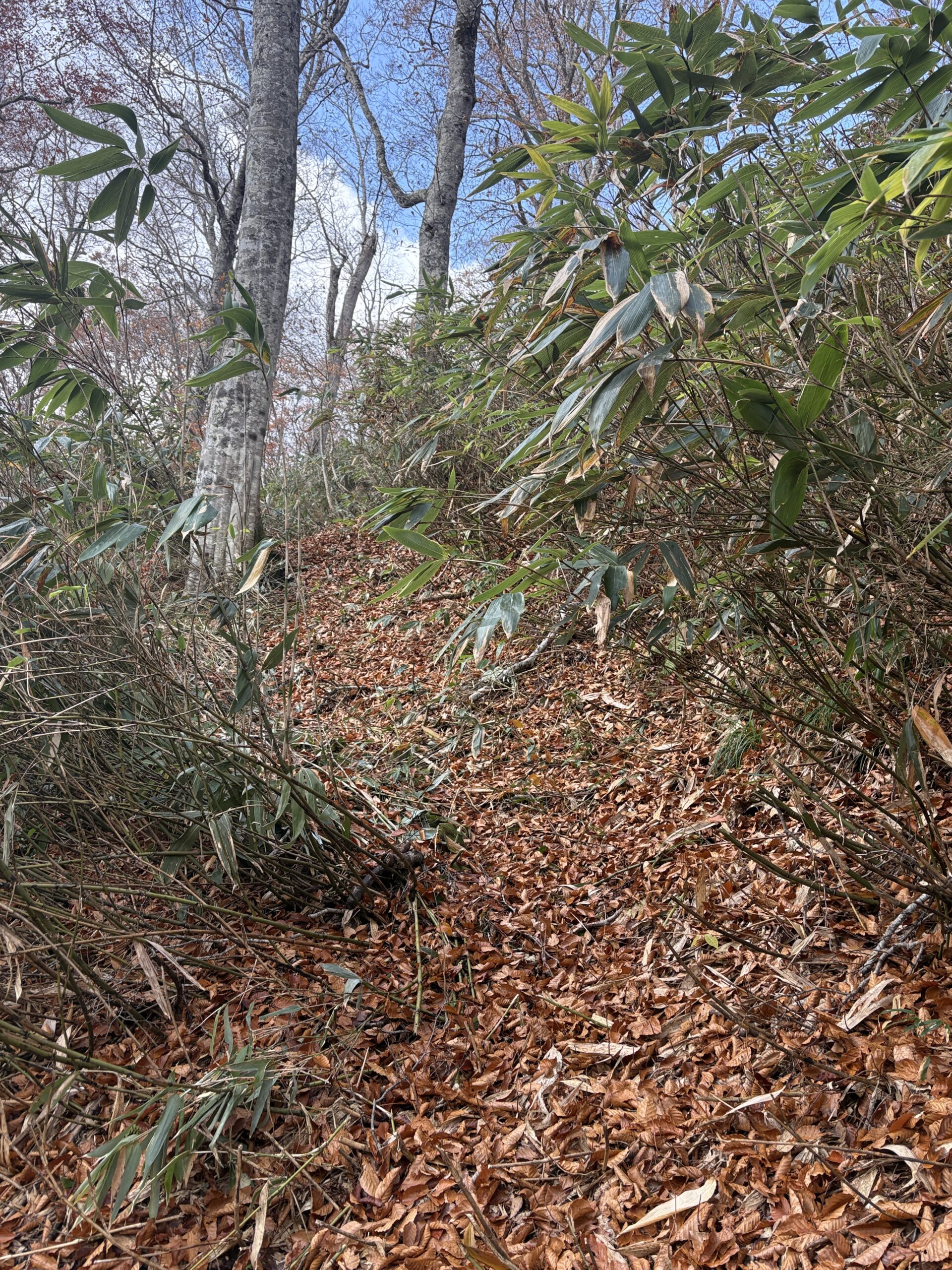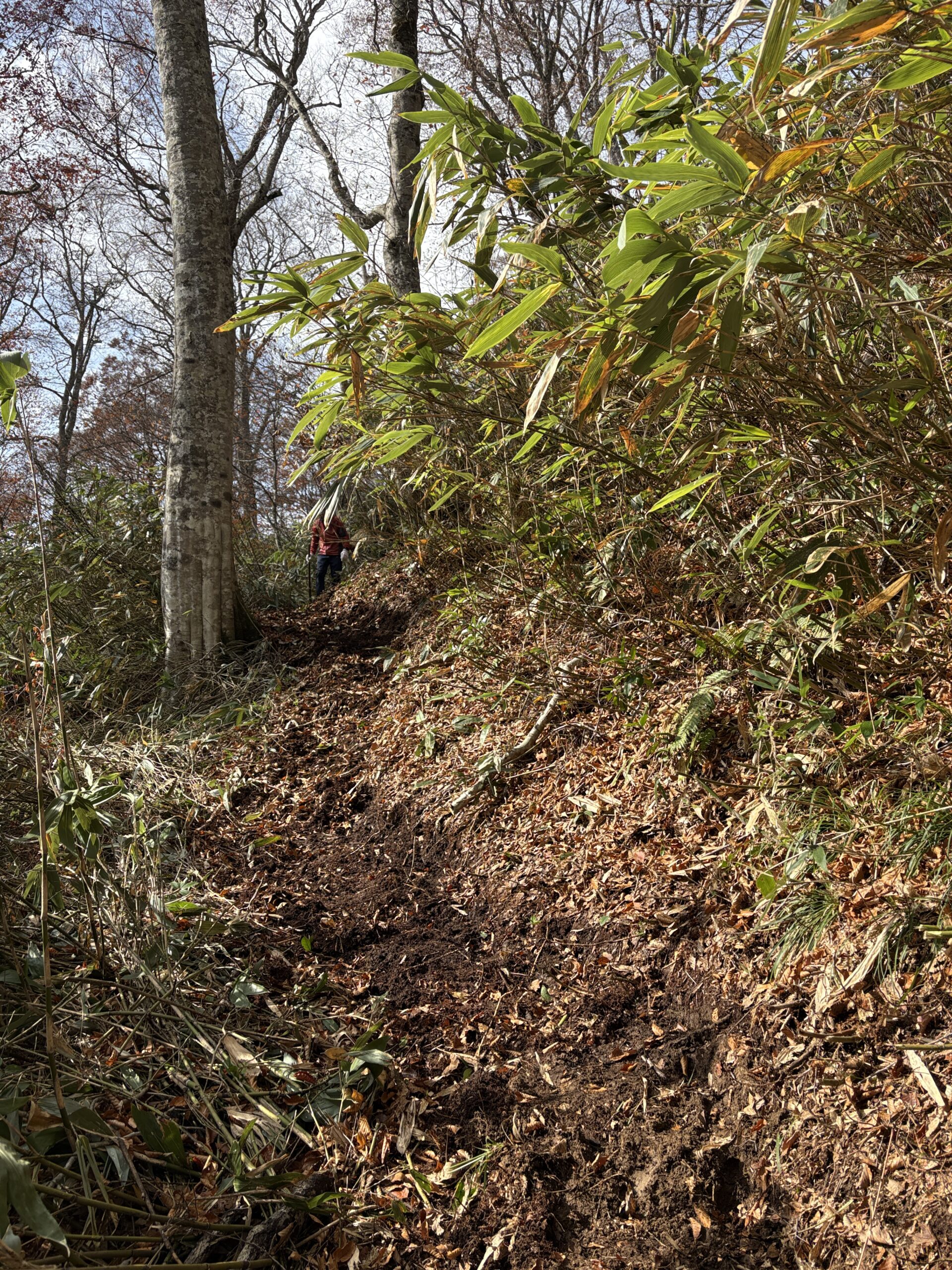右から熊笹が覆い被さり、登山道は谷側に傾いています