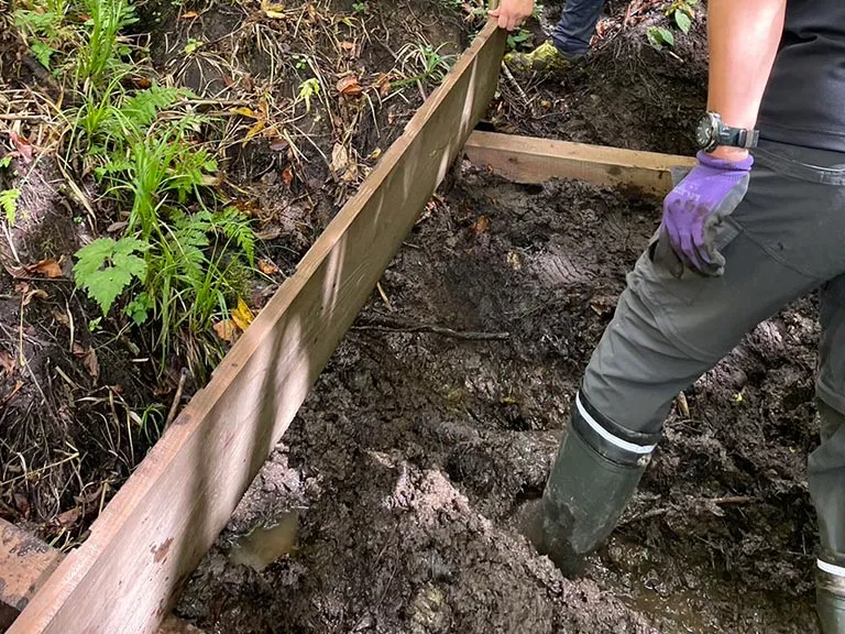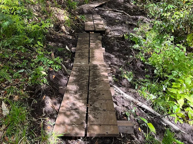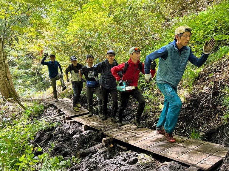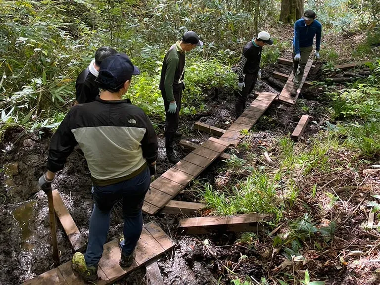 ぬかるみの原因の水源を見つけ水の流れを作る。脆弱な土壌のため木道で侵食を防ぐ
