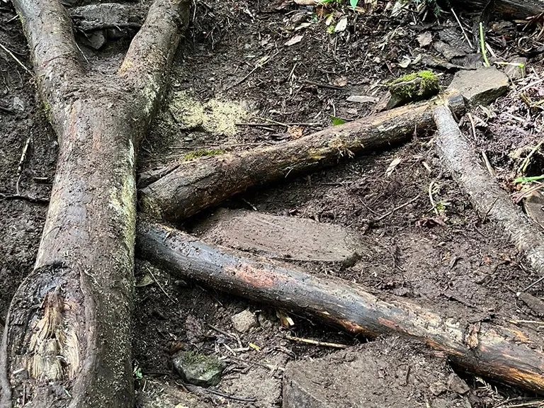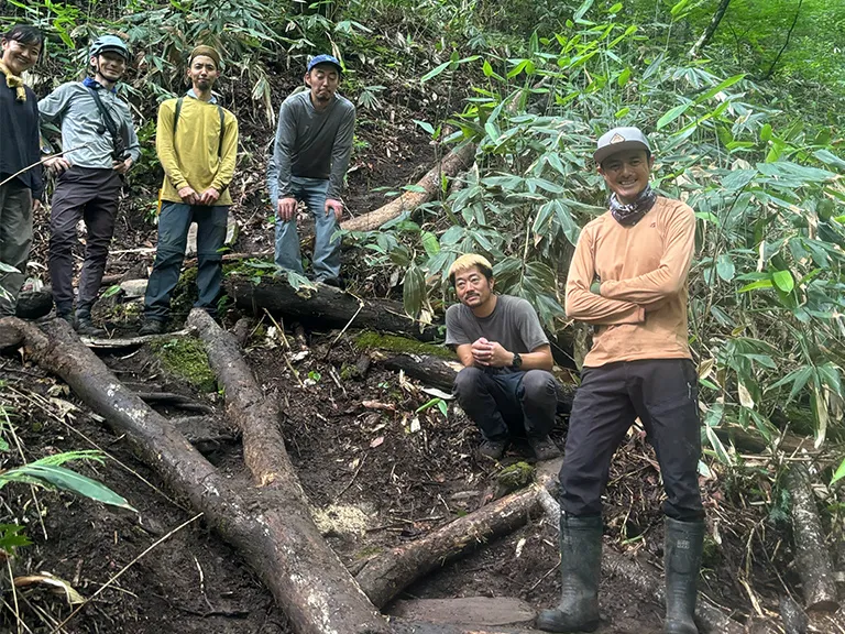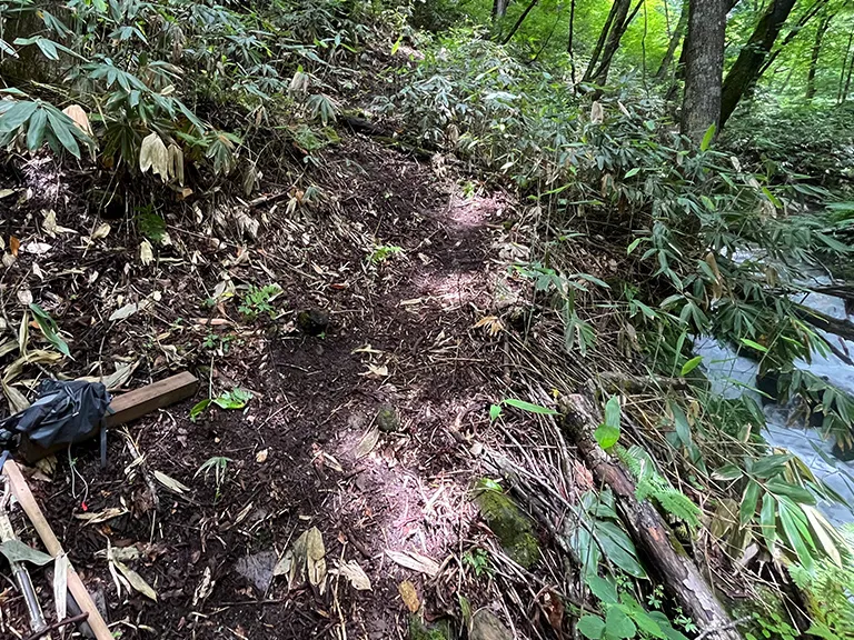足がかりのない急斜面の登山道に、侵食を防ぐように地形や水の流れを考慮したステップを設置