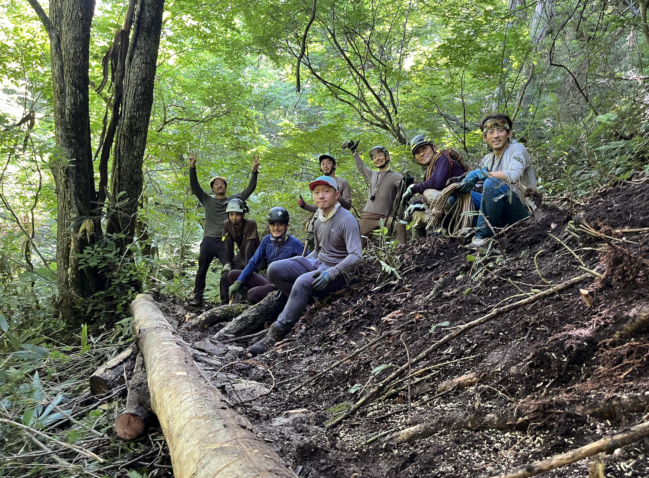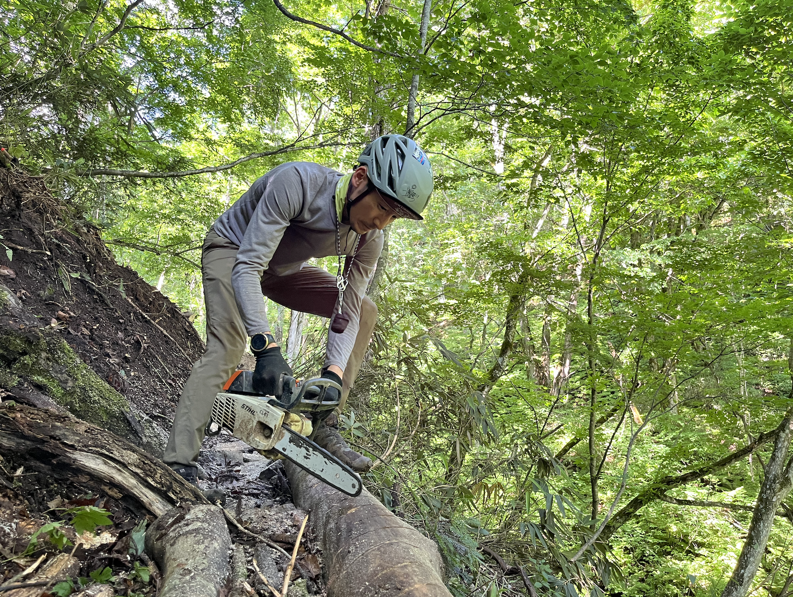 足がかりのない急斜面の登山道に、侵食を防ぐように地形や水の流れを考慮したステップを設置