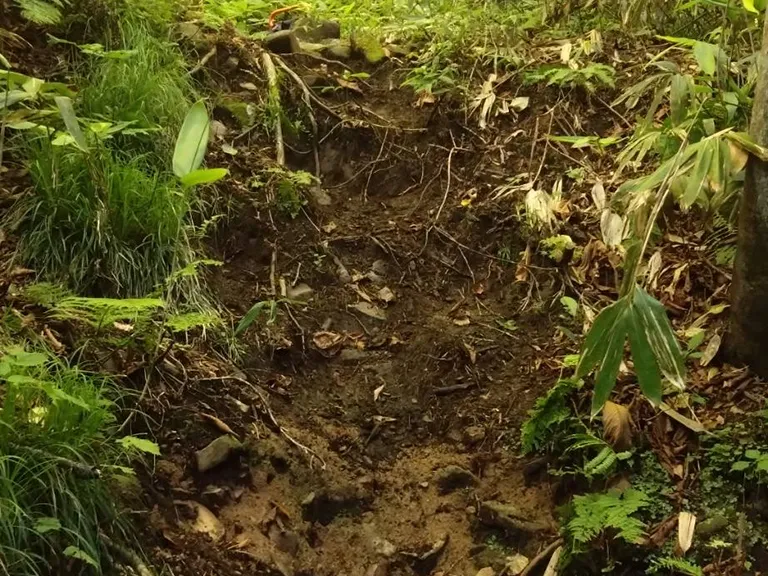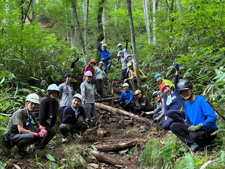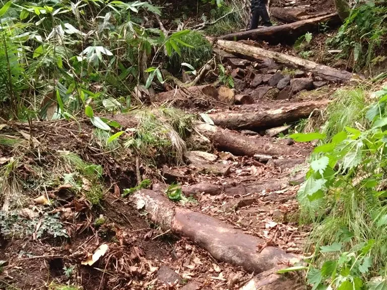 足がかりのない急斜面の登山道に、侵食を防ぐように地形や水の流れを考慮したステップを設置